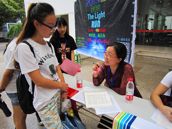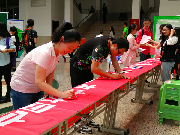朗诵协会报名处及横幅签名工作台,可谓是形式多彩、气氛热烈,吸引着大量前来报名、咨询、诵读的大学生们。现场13名测试员放弃休息时间,热情、耐心、细致地为每一位参与活动师生答疑,充分体现了我校测试员队伍凝心聚力、敬业奉献的团体品质。