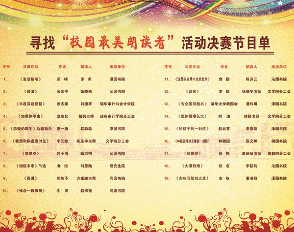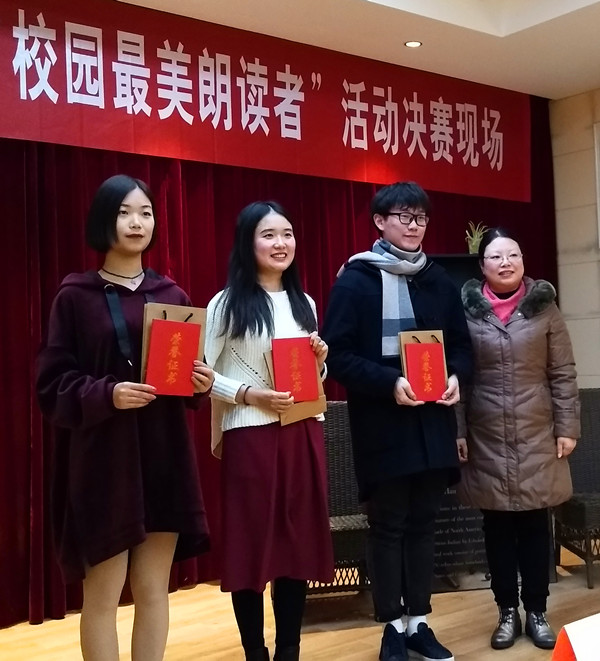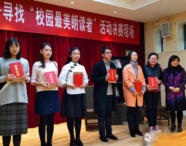 本次“寻找校园最美朗读者”活动历时一个多月,学生报名人数约300多人;教职工报名人数近50多人。选手们经过初赛、复赛,最后13名学生、6名老师进入决赛。
