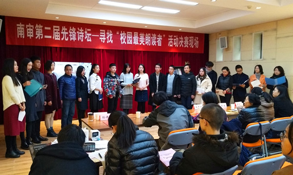 12月13日下午,由校语言文字工作委员会主办;校普通话培训测试站、校工会、润泽先锋书店承办;澄园书院科学技术协会、润园书院学习支持与生涯发展中心办公室、泽园书院校园文化中心成才规划部、沁园书院学生学习与成长指导中心、南审读书人、南社诗刊、蓝莓工作室、荻思文学社、图书馆学生管理委员会、红帆船话剧社协办的第二届先锋诗坛——“寻找校园最美朗读者”活动在润泽先锋书店万竹堂顺利进行,校语委主任董必荣副校长、校语委办副主任刘顺、万币钱包 王军副院长亲临决赛现场。