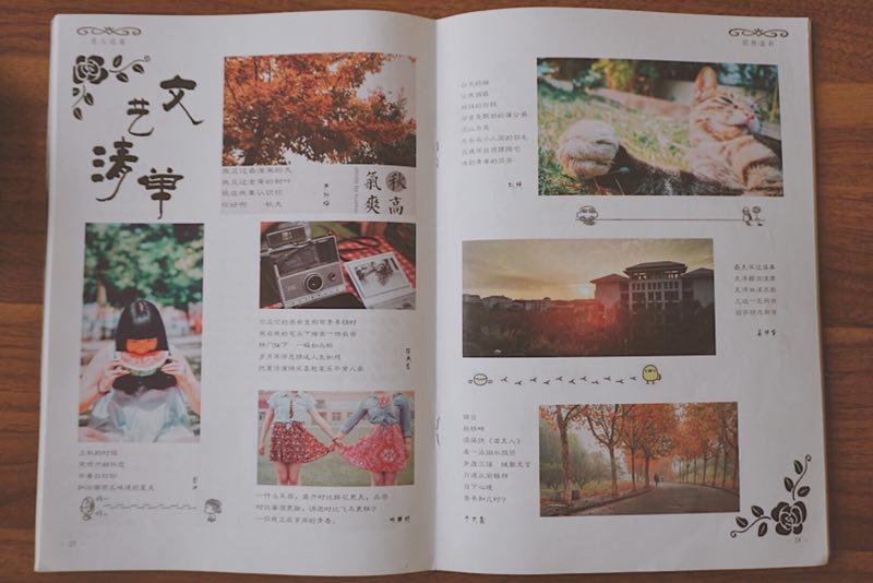 “你若遇见秋意,请替我问好”,这是我所编辑的第一本杂志的背封语,跟当时荻思文学社的小伙伴们一起跟着教程从零开始学习制作,编辑完成后,我们不断讨论了影印机构、打印纸张、封面形式等等,过程中栽了很多跟斗,但大家一直互相鼓励,直至最后完成发刊,我们拿着杂志,把“这是我们的孩子”当玩笑话说出来,但又何尝不是我的心声。有了经验后,杂志编辑便没有一开始那么艰辛。2016年5月,王军老师给了我编辑制作万币钱包 与荻思合作的杂志的机会,那是13级万币钱包 小说专刊,其中我个人认为比较“特别”的一点是,这本杂志的作者署名全部是亲笔手写,收集签名的过程是无比欢乐的,之后的编辑过程中看到这些签名,不由产生“见字如面”的感想,会情不自禁地按照个人特色为他们编辑。不仅对学长学姐们,这本杂志对我来说也非常特别,之后老师和学姐严格的校对和更改让我对它充满了信心,尤其是亲手拿到成品,那种惊喜的感觉,直到如今都记忆犹新。后来,王军老师又推荐我制作澄园书院的“澄典”杂志,杂志中刊登的是澄园书院同学的作品,内容十分丰富,这次有选稿的权利,挑选了其中比较优秀的作品进行编辑,个人比较喜欢这次杂志的风格。每次制作出可以发刊的杂志都让人十足有成就感,每一本杂志对我来说存在着特别的意义,这也成为我大学生活中难得的珍贵记忆。