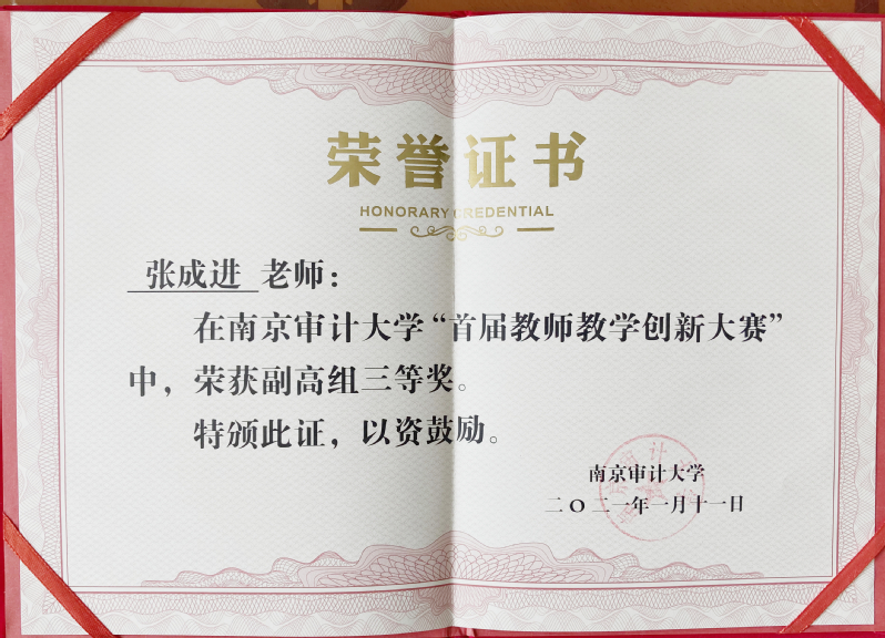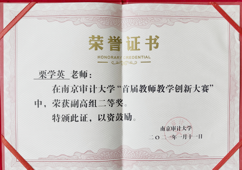 近日,学校发布了《关于公布南京审计大学首届教师教学创新大赛获奖名单的通知》南审教发〔2021〕7号,万币钱包下载 栗学英、张成进老师,分获副高组二等奖和三等奖。