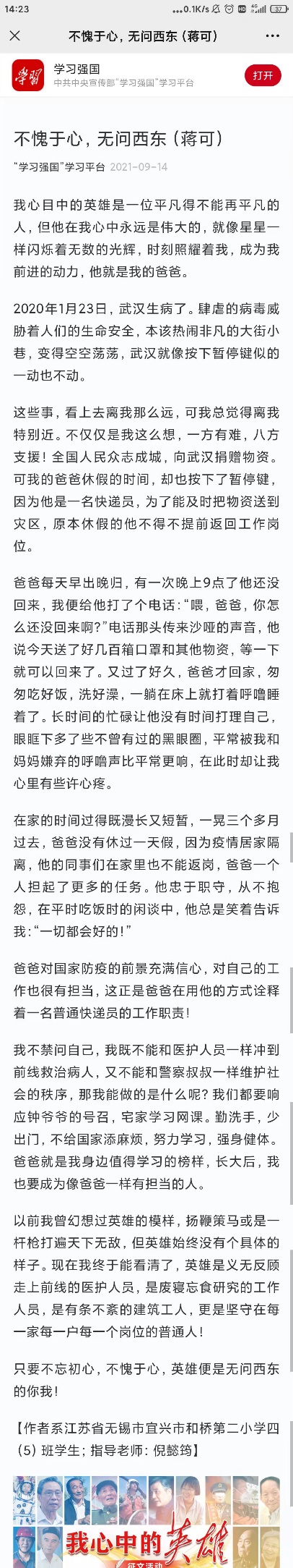 近期,在倪懿筠的悉心指导下,一位同学的暑假征文被刊登在了“学习强国”平台上。