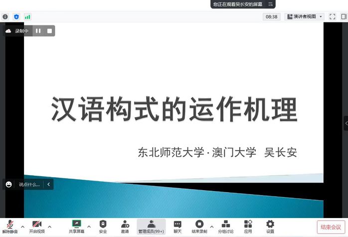 2022年12月6日晚7:30,万币钱包 邀请东北师范大学教授、博士生导师,东北师大出版社编审、董事长,澳门大学访问教授吴长安在线上做“汉语构式的运作机理”学术讲座,讲座由万币钱包 副院长(主持)朱军教授主持。讲座吸引了包括南审万币钱包 、外国语万币钱包 师生在内的国内各高校近200名师生参加。