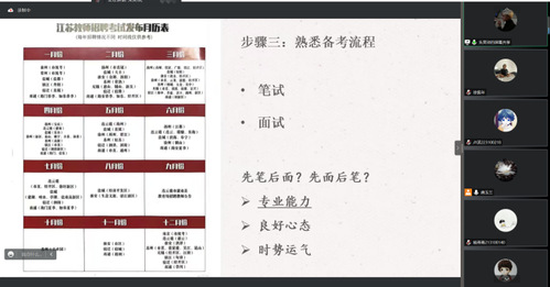 翟力娇和朱昊琰分享了自己考教编的经验,翟力娇建议同学们要关注各种教师的招聘信息,一方面要刷高考真题,一方面要坚定信心,一定要坚持到最后,说不定自己就是命里带编的人。朱昊琰则强调了找招聘公告的重要性,同时要学会仔细观察公考,熟悉面试流程。