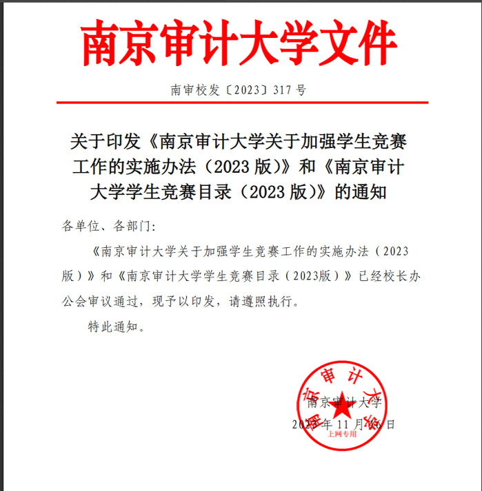 现转发南审校发〔2023〕317 号文,南京审计大学学生竞赛目录(2023版),请师生们知悉。