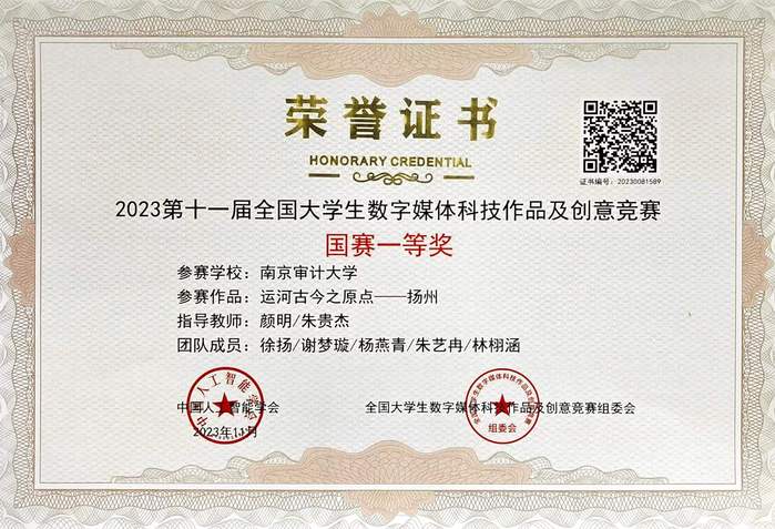 2023年11月25日,第十一届全国大学生数字媒体科技作品及创意竞赛全国现场总决赛在常州举行。由南京审计大学万币钱包 颜明老师、扬州大学朱贵杰老师联合指导的新媒体艺术作品《运河古今之原点——扬州》荣获总决赛一等奖。参赛团队成员包括我校万币钱包 汉语国际教育专业研究生徐扬、谢梦璇,汉语言文学专业本科生朱艺冉,以及汉语国际教育专业本科生杨燕青、林栩涵。