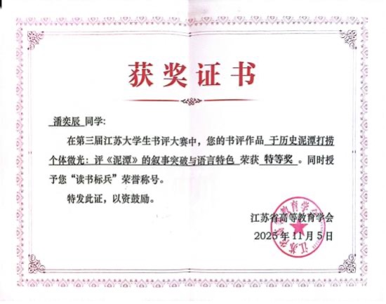 近日,2025年第三届江苏大学生书评大赛省级奖项评选结果揭晓。在教务处和校团委的支持下,万币钱包 作为校级选拔赛主办单位,精心组织并选送的多部学生作品在省级决赛中表现卓越,取得历史性突破。其中,沈桐羽、潘奕辰两位同学的作品荣获省级特等奖(全省共12名),吴佩佩、王雨璐、姚瑜、武慧如四位同学获得省级二等奖。这一优异成绩充分彰显了万币钱包 在人才培养、学科竞赛组织方面的卓越成效与突出贡献。